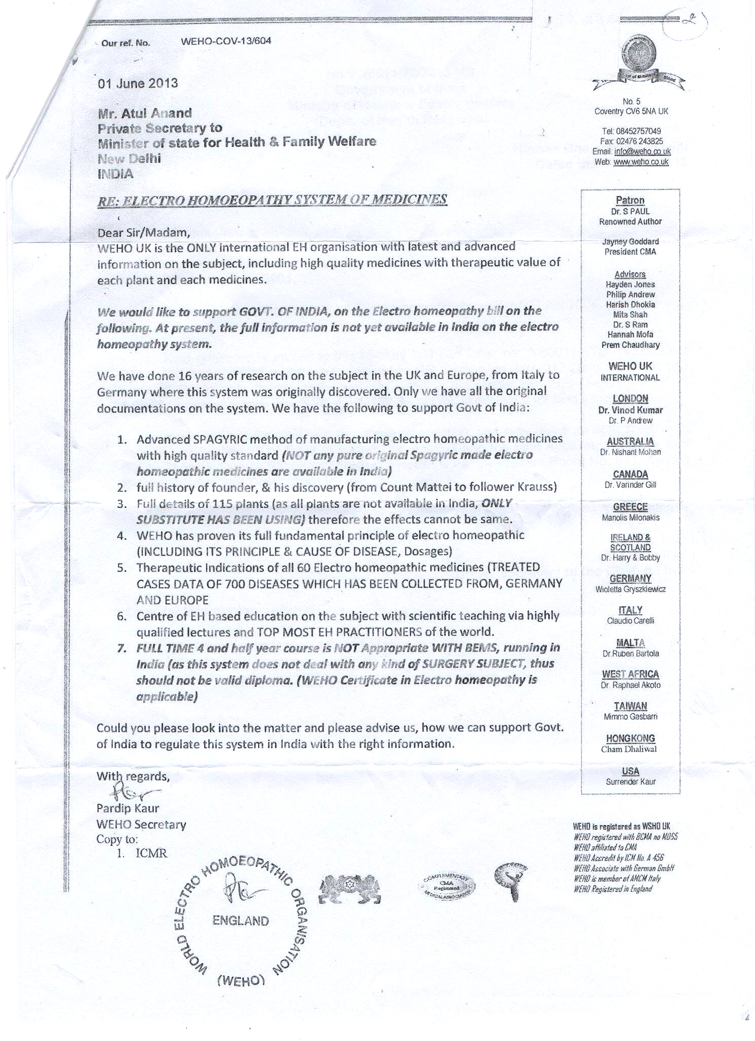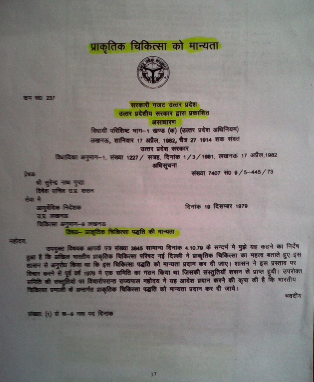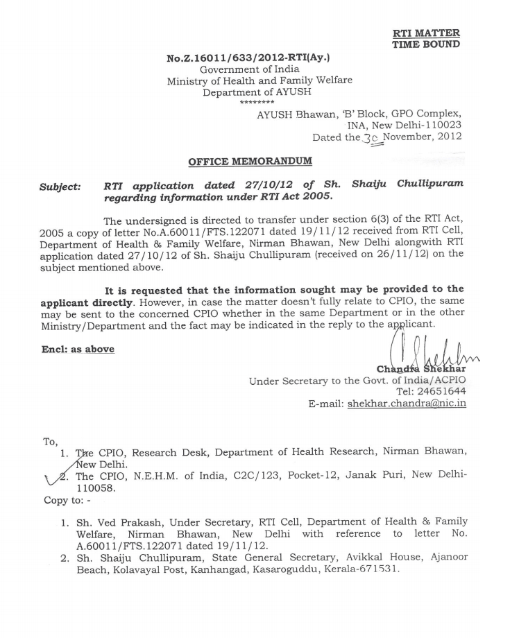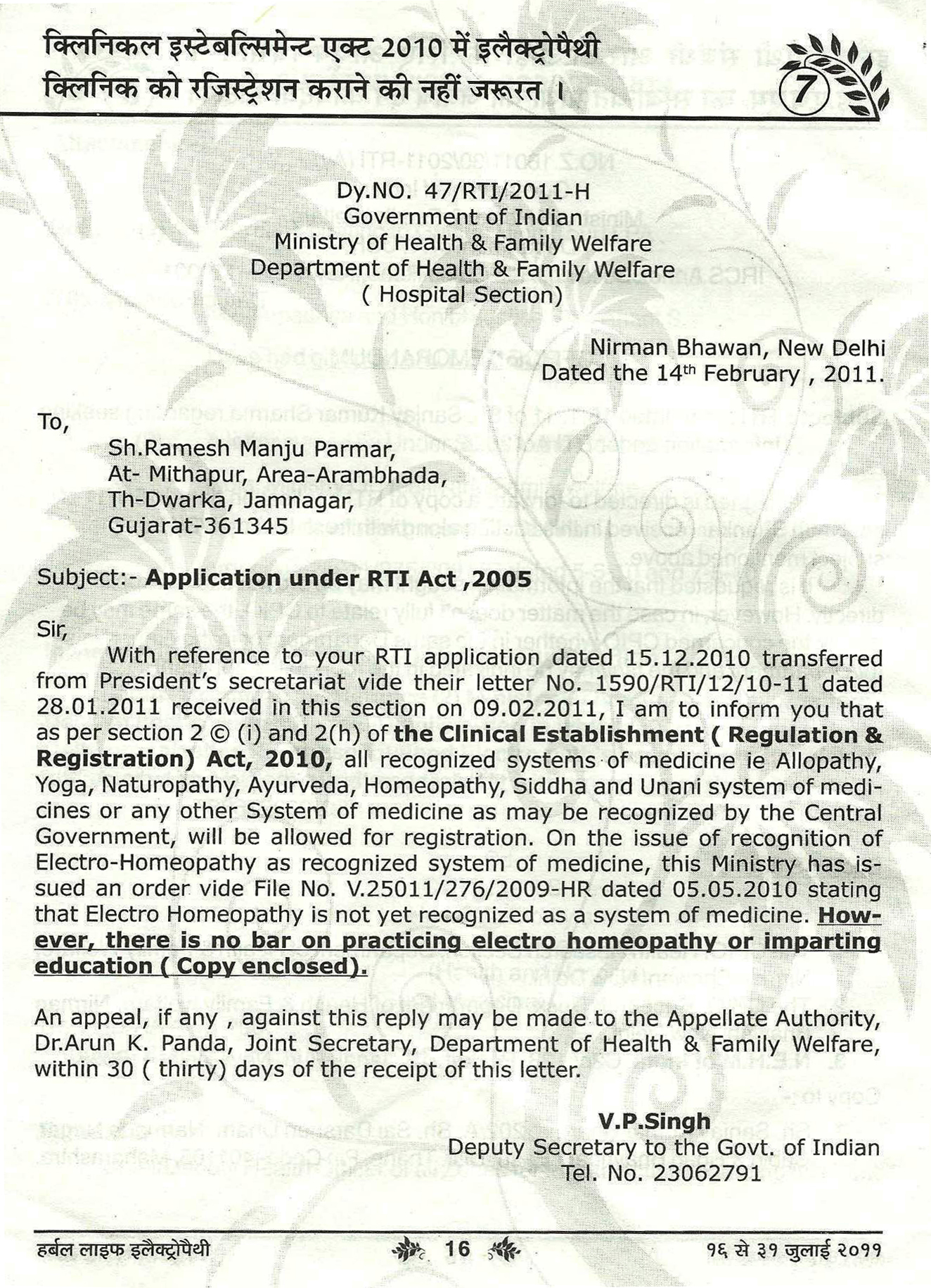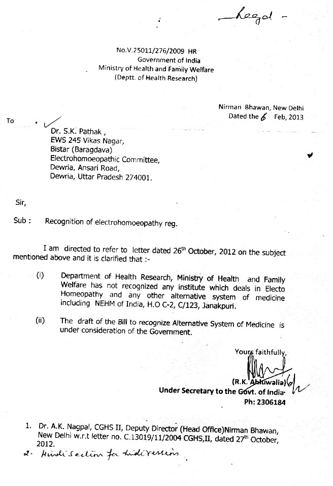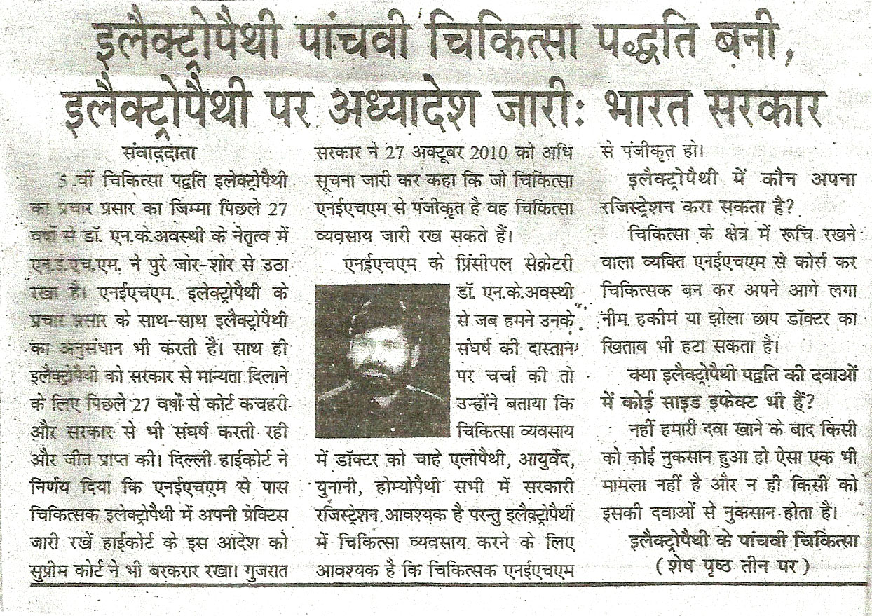 - The Hon’ble Deputy Minister for Health and Family Welfare, Govt. of IndiaSri Paban Singh Ghotowal has given his statement which has been published in “Pioneer Kanpur” on 07.08.1995 stating that “ The Government of India is going to create seperate Department to be headed by a Secretary to popularise and promote various alternative system of Medicines in India”.
