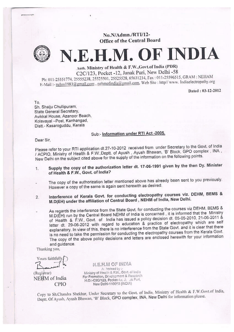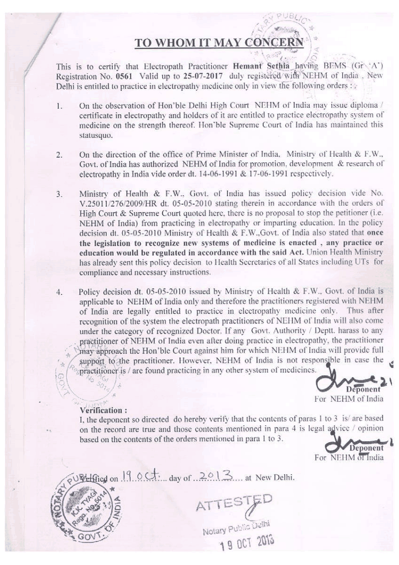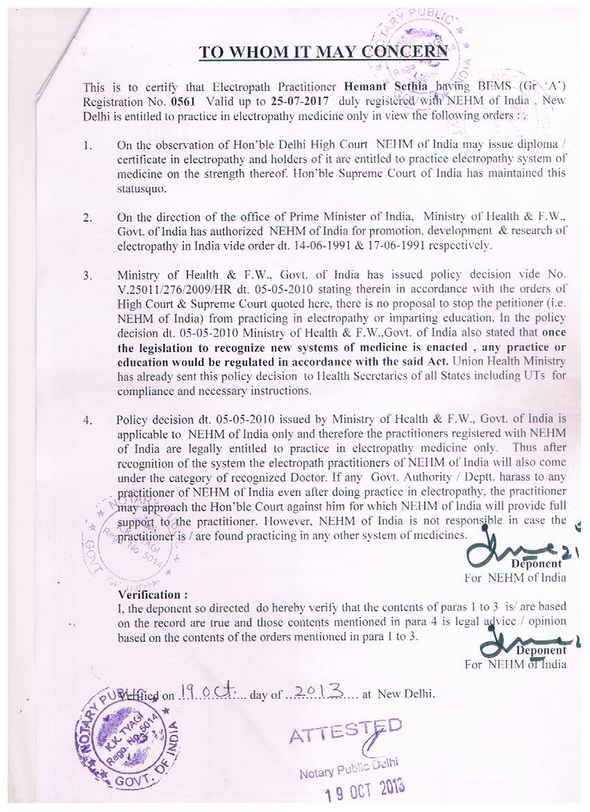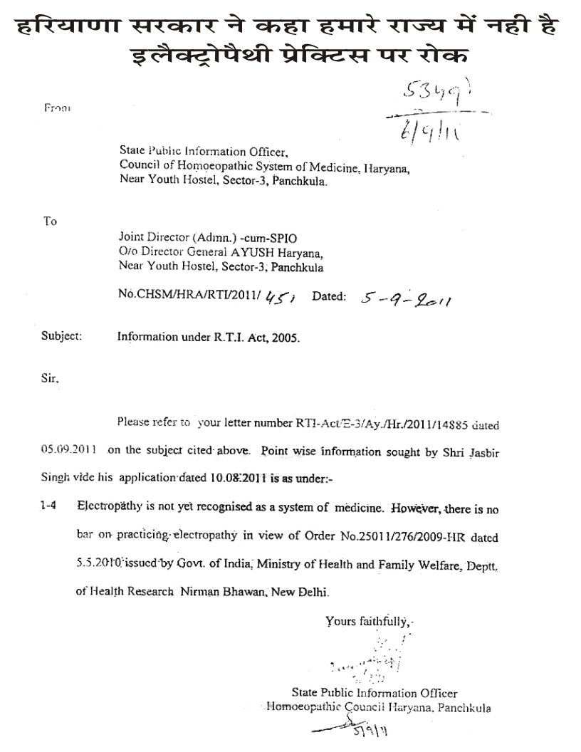 - Haryana Govt Electropathy NOC letter