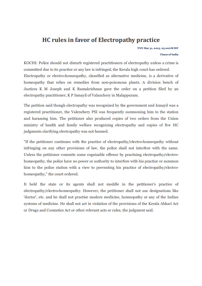 - HC Rules in favour of electropathy practice