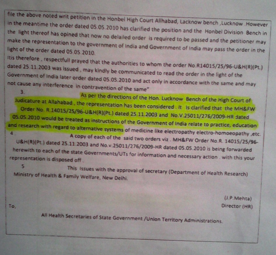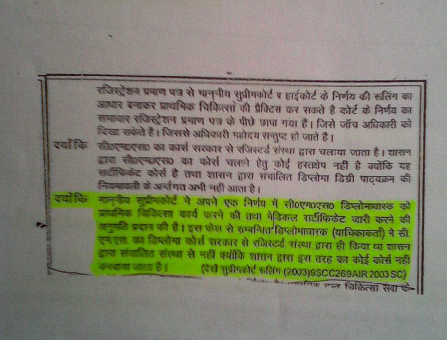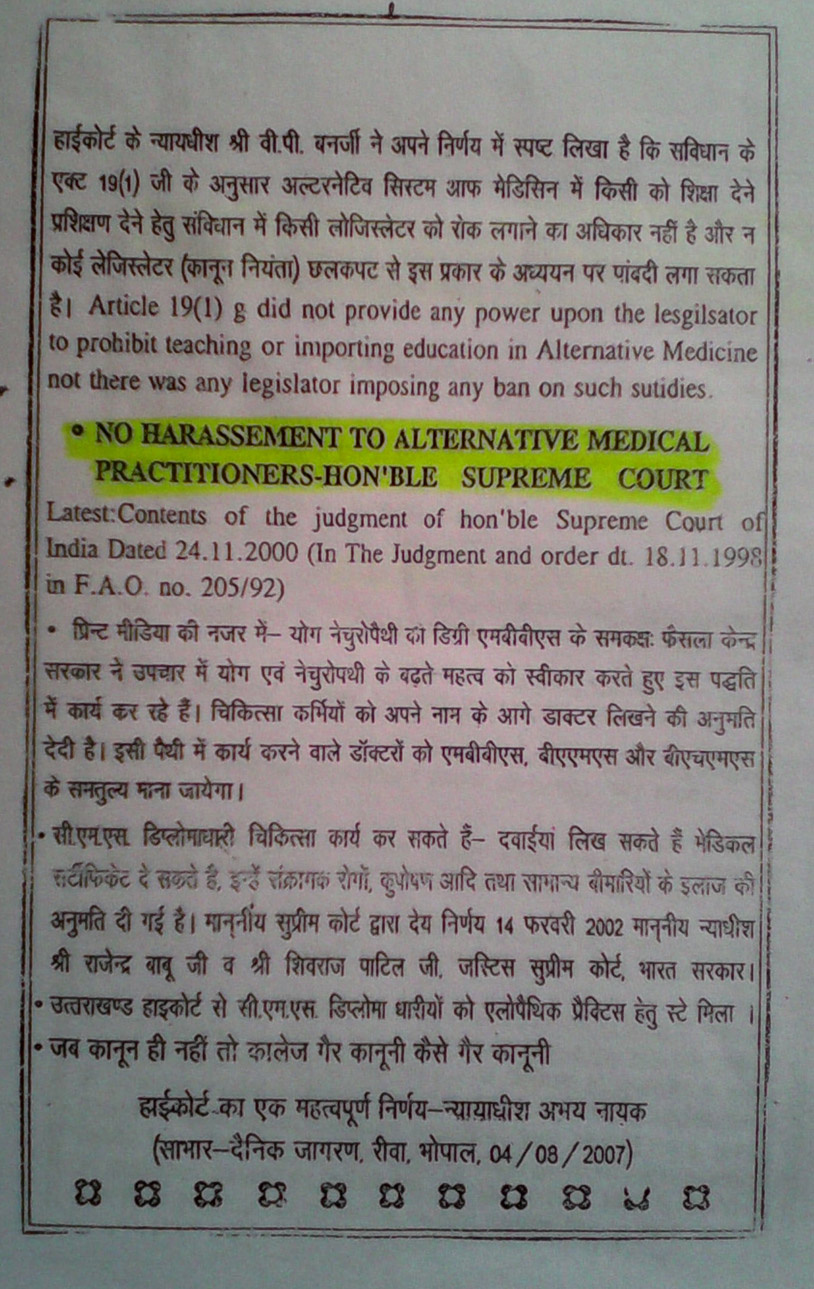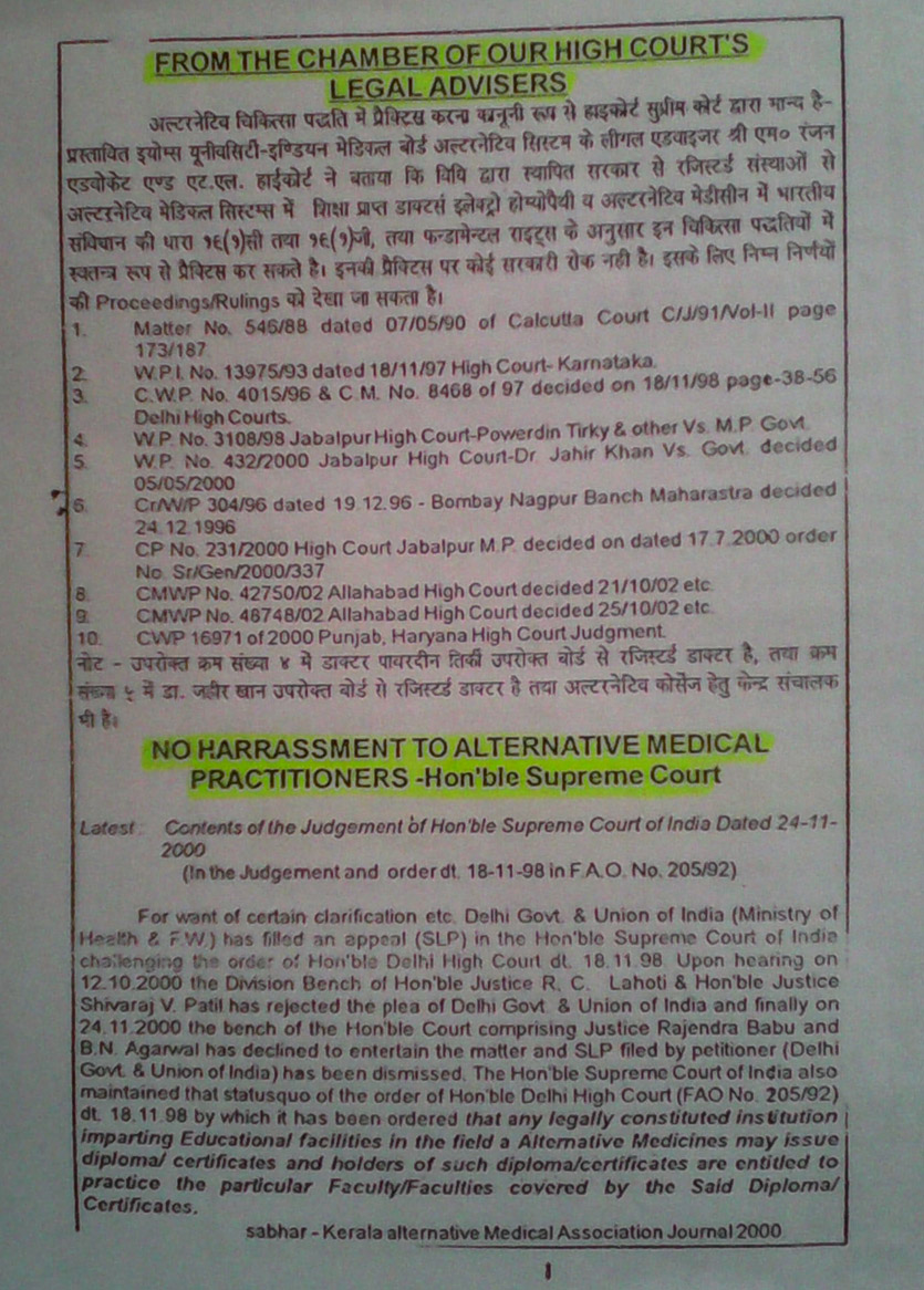 - The Hon’ble supreme court of Delhi, stated in its final judgement of a case on alternative system of Medicine that “the Judegement of Hon’ble High court of Delhi must be strictly followed by the Govt. of India within Eight weeks” to regularise and recognise the alternative system of medicines.